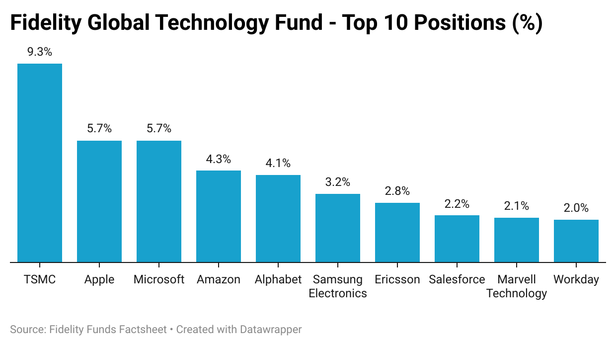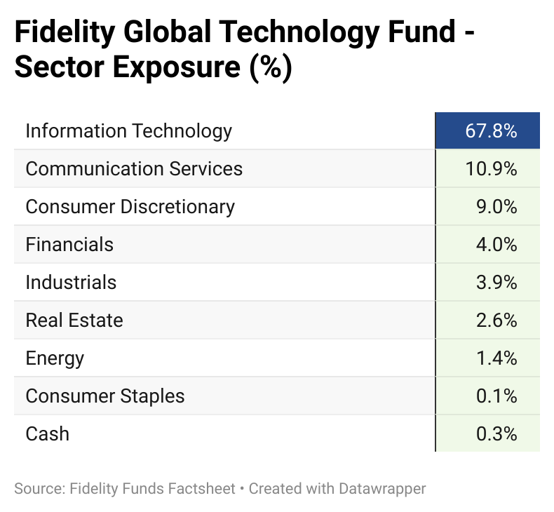Over the last decade, the Fidelity Global Technology Fund has delivered ~19% annualised (net of fees) returns, handily outperforming its peer group. In the past year alone, it’s returned over 27% (as of Oct 2025 and net of fees), reflecting its strong positioning in AI and semiconductor tailwinds.