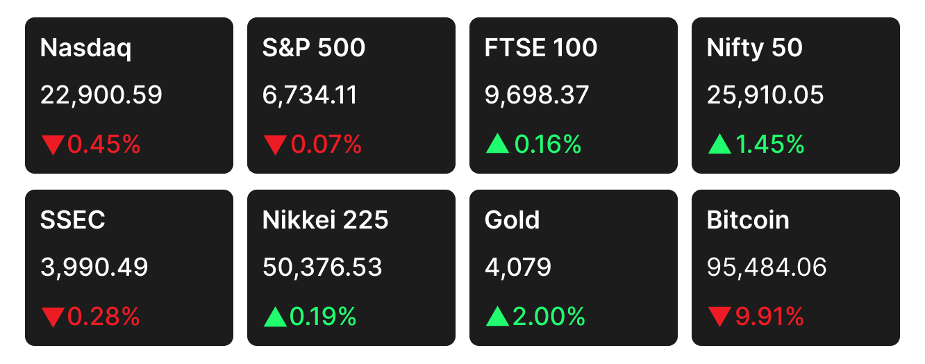China | The CSI 300 slipped 1.08 percent as October data showed slower spending and industrial activity. The property market stayed weak, but stimulus and a U.S.–China trade truce helped steady sentiment. Hong Kong’s Hang Seng rose 1.26 percent.