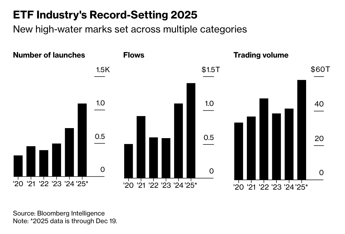 The U.S. ETF industry is closing 2025 with records everywhere. $1.4 trillion in inflows. More than 1,000 launches. Trading volumes at all time highs. The last time all three peaked together was 2021.