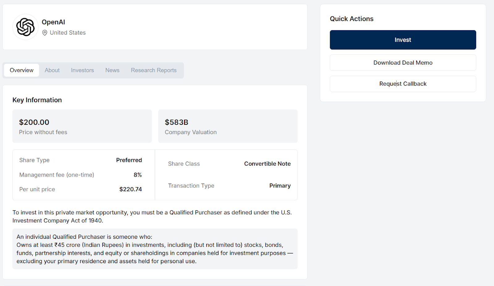 Some deals are open to any fully onboarded Vested user with sufficient funds. Others are restricted to what US regulations define as a Qualified Purchaser. A Qualified Purchaser is an individual who owns at least Rs. 45 crore in investments, including stocks, bonds, funds, and partnership interests, excluding your primary residence and personal assets.