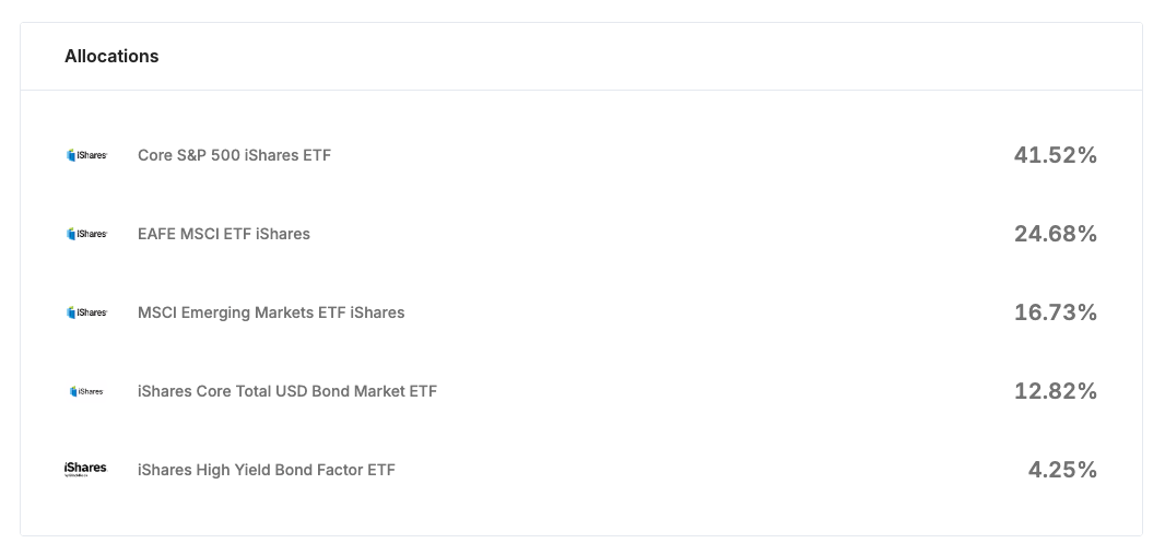 In the Vested platform, the Multi-Asset Class – Aggressive portfolio, for instance, places a significant portion of the allocation in global equities through ETFs while maintaining smaller allocations to fixed income instruments.