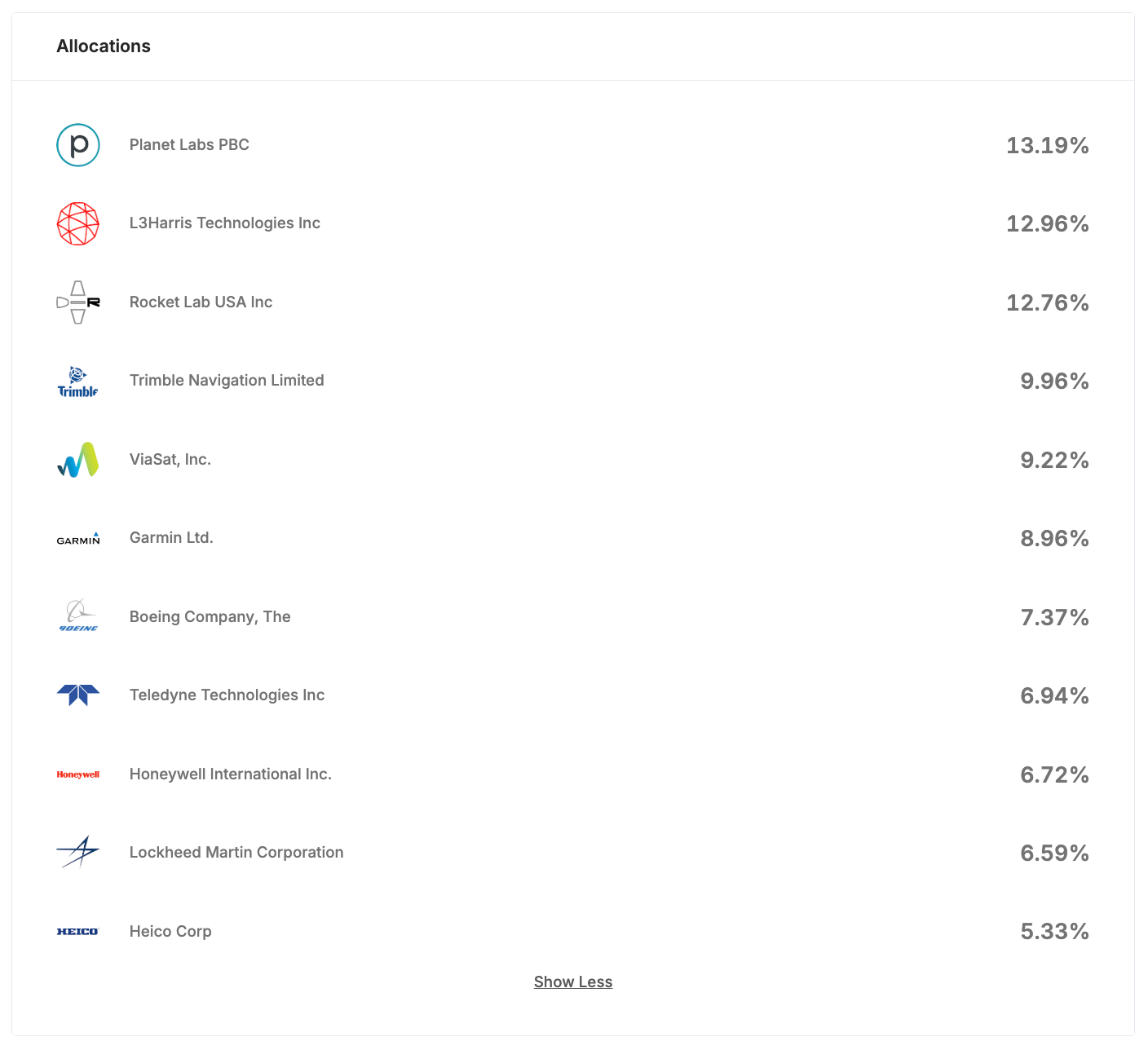 Other companies in the portfolio include firms such as Garmin, Boeing, Teledyne Technologies, Honeywell, Lockheed Martin, and Heico, which provide aerospace components, satellite systems, navigation technologies, and mission-critical infrastructure used in space-related applications.