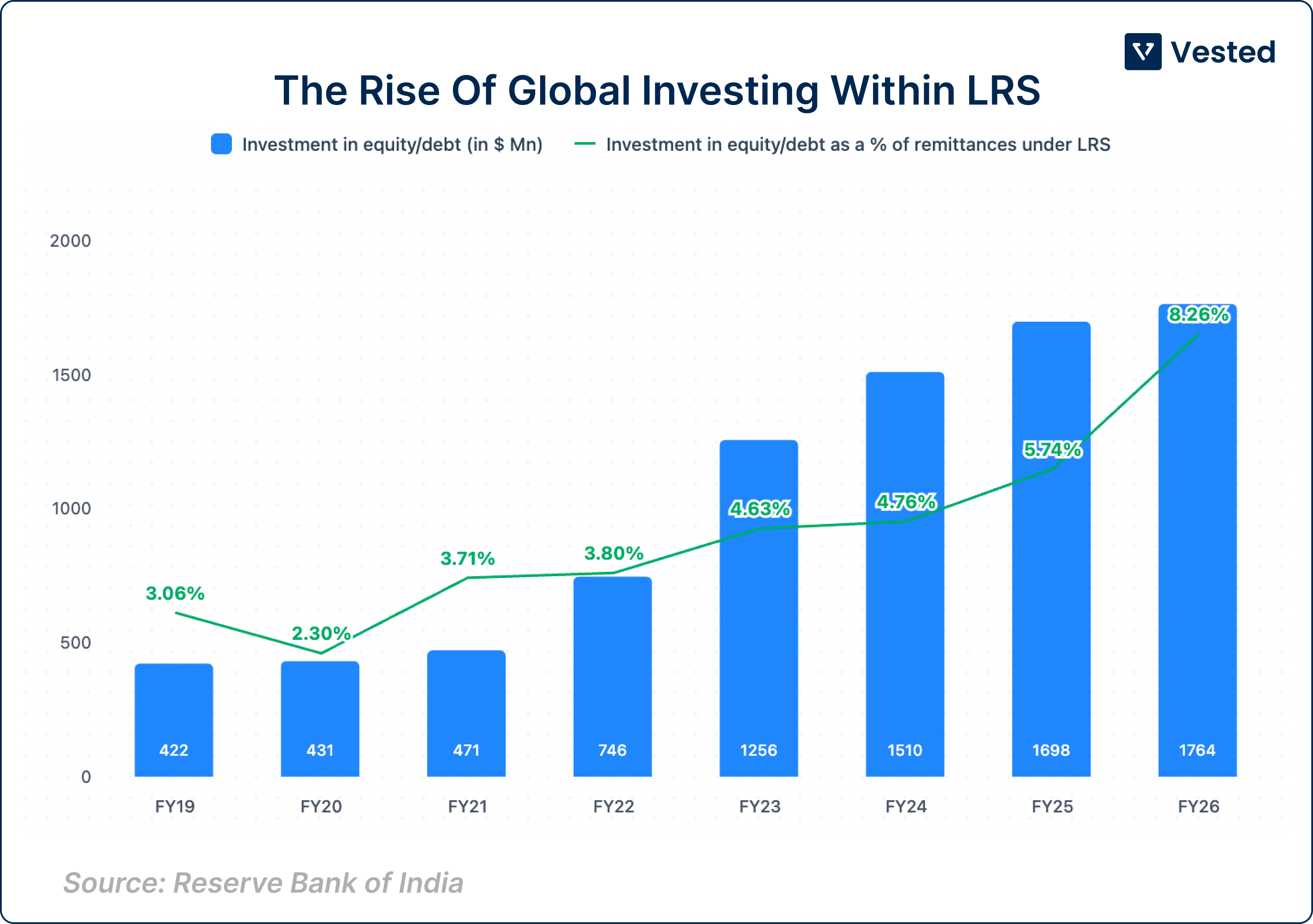In FY19, Indians invested roughly USD 422 million abroad in equity and debt through LRS. By FY26, that number had grown to about USD 1.76 billion.