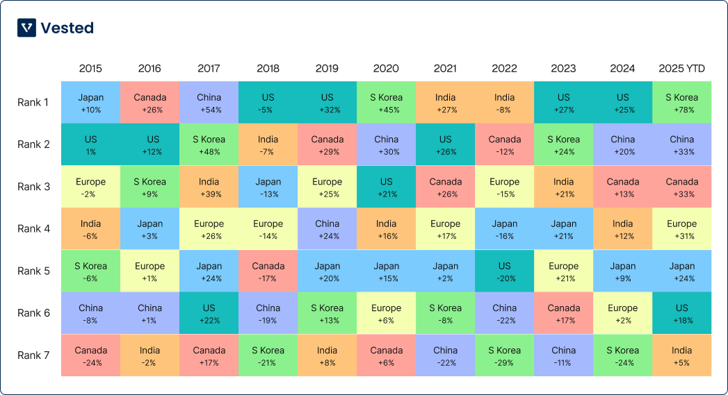 Also, if you look at country-level data from 2015 to 2025, the ranking based on returns keeps changing. Japan is at the top in some years. The US leads in others. India has strong years as well, including 2021.