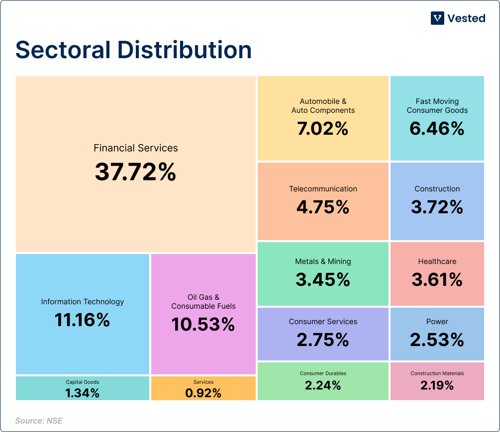 If you look at the Nifty 50, for example, about 38% of the index is in financial services. IT makes up around 10%, and FMCG with the consumer goods sector, stands at about 10%.
