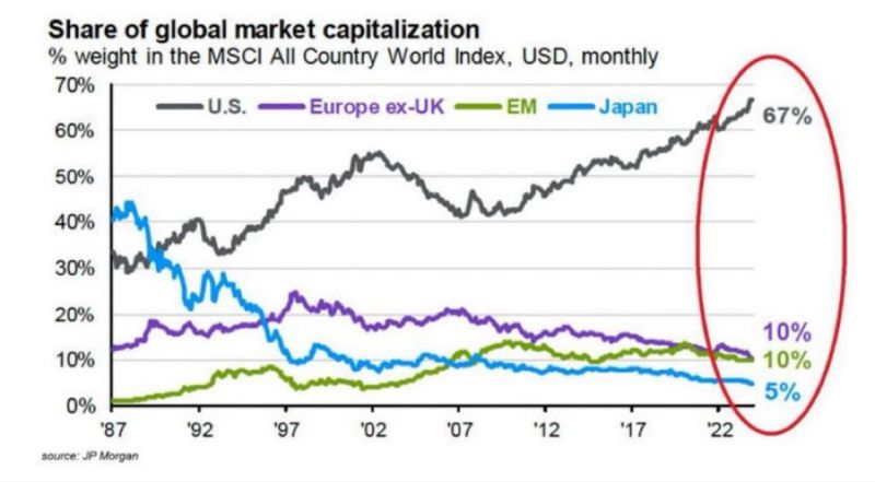 Over those decades, Japan’s position in the global market shrank dramatically. Its share of world equity markets fell from 42% at the peak to roughly 6% today.